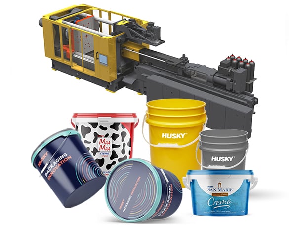 Husky's pail and lid molding solutions are designed to produce durable, lightweight containers with fast cycle times, lower material costs, and reliable processing of sustainable raw materials, including post-consumer recycled (PCR) content.